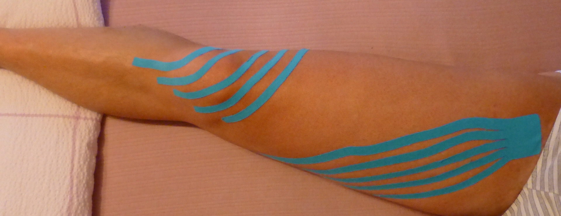 Das K-Tape ist eine Anwendung die die vorangegangene Therapie unterstützt und die man „mit nach Hause“ nehmen kann.